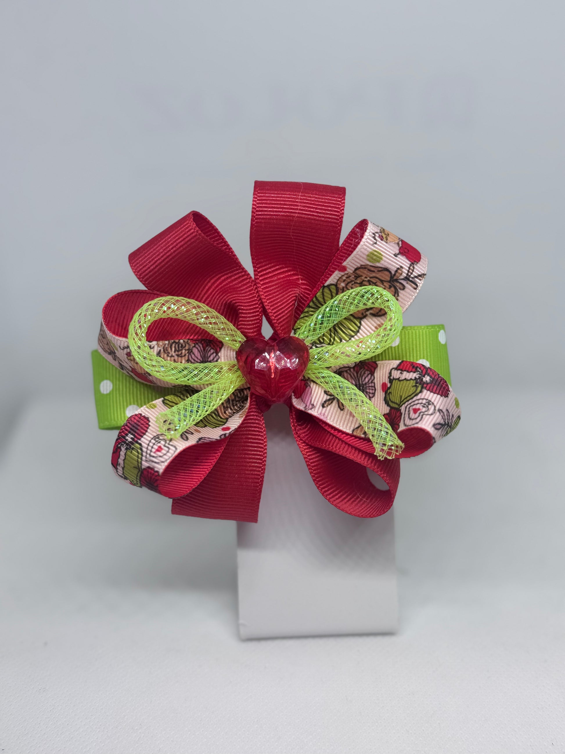 This colorful Christmas bow features bright solid red and green polka dot grosgrain ribbon. It measures approximately 4 inches wide and 3 inches tall. It has an alligator clip to attach to your hair.