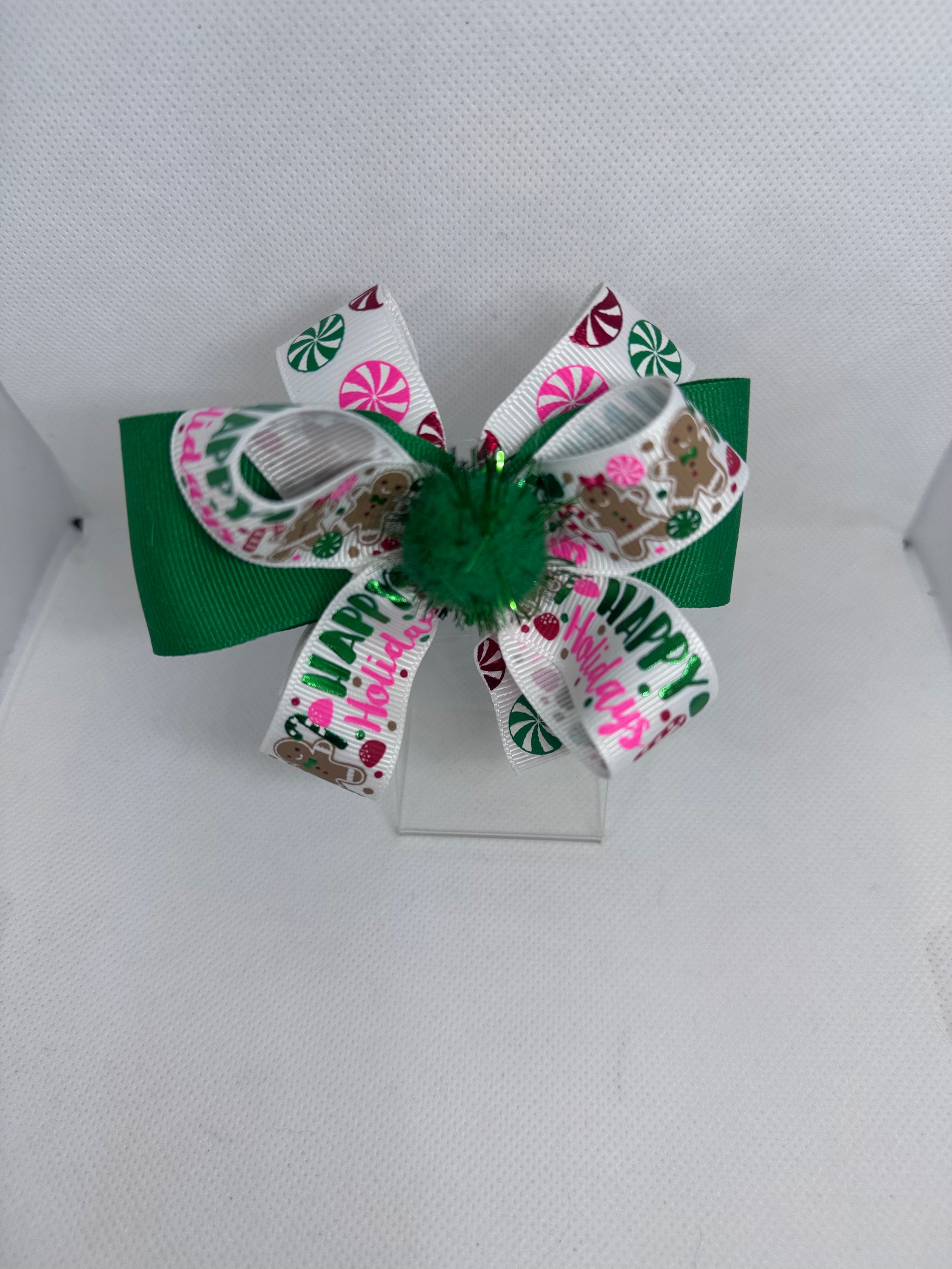 This colorful Christmas bow features printed and green grosgrain ribbon with a pompom center. It measures approximately 4 inches wide and 3 inches tall. It has an alligator clip to attach to your hair.