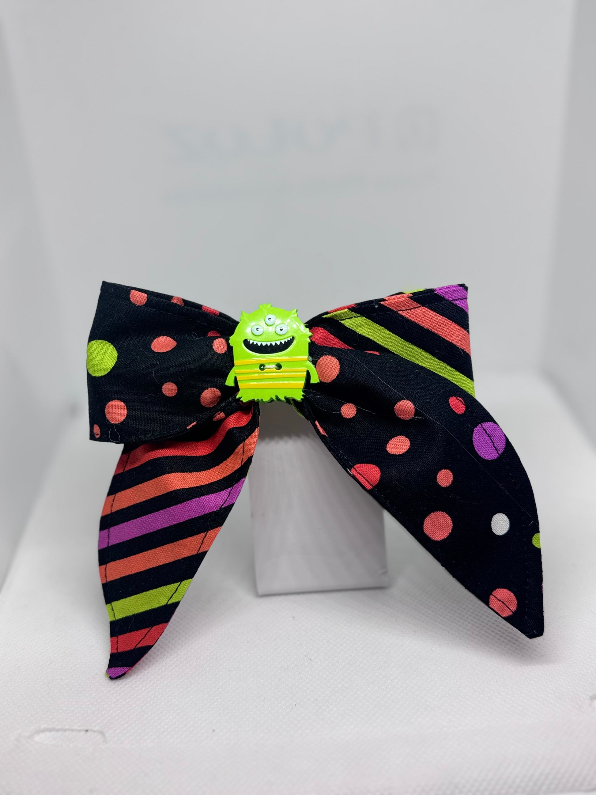 The Halloween Dots and Stripes Hair Bows are hand made from cotton fabric. They feature an alligator clip to attach to your hair.